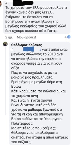 Σε άρθρο του δημοσιογράφου Γιάννη Σινάνη, που δημοσιεύθηκε στο μέσο κοινωνικής δικτύωσης «LESVOSNEWS.GR» με τον τίτλο «Επιτέλους αναστηλώνεται από ιδιώτη επιχειρηματία ο Άγιος Κωνσταντίνος στη Βρίσα» και αναφερόταν στην ανάληψη του έργου της αποκατάστασης του Ιερού Ναού του Αγίου Κωνσταντίνου από τον συγχωριανό μας επιχειρηματία κ. Θεόδωρο Κούσκο του Γεωργίου , με μεγάλη έκπληξη διαβάσαμε το παρακάτω σχόλιό του: