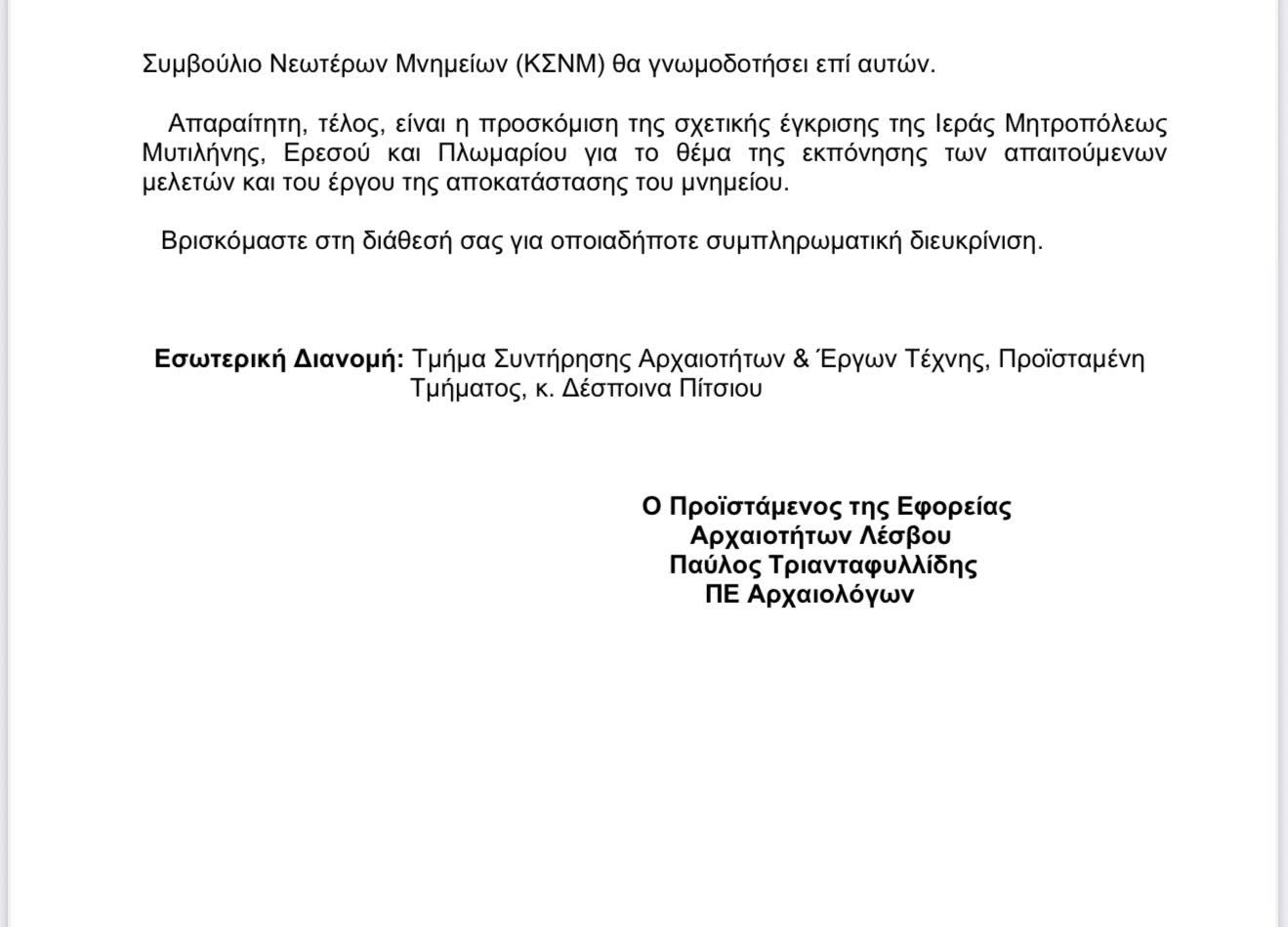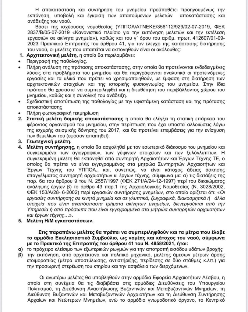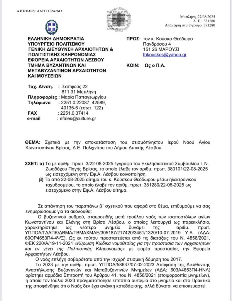 Τις δημοσιογραφικές πληροφορίες για την πρόθεση του χωριανού μας επιχειρηματία να αναλάβει την αποκατάσταση του ναού του Αγίου Κωνσταντίνου στη Βρίσα ήρθε να επισημοποιήσει ανάρτηση του Θ.Γ.Κ. στην οποία παραθέτει το παρακάτω έγγραφο της Εφορείας Αρχαιοτήτων Λέσβου, στο οποίο αναφέρονται αναλυτικά οι εργασίες που πρέπει να γίνουν.