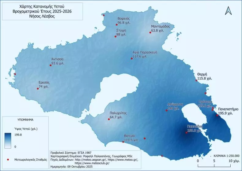 Προς ενημέρωση σας, ο μετεωρολογικός σταθμός μας Πολιχνίτου βρίσκεται εκτός λειτουργίας και προβλέπεται να αντικατασταθεί προσεχώς… άρα και η σχετική βροχόπτωση του δεν ισχύει. Ο σταθμός μας στα Βατερά (τοποθεσία Χοχλατσάρι) λειτουργεί. Θα επανέλθουμε με νεότερα όταν υπάρχουν, και με την εγκατάσταση μιας νέας διαδικτυακής κάμερας στην ευρύτερη περιοχή… http://meteo.aegean.gr/