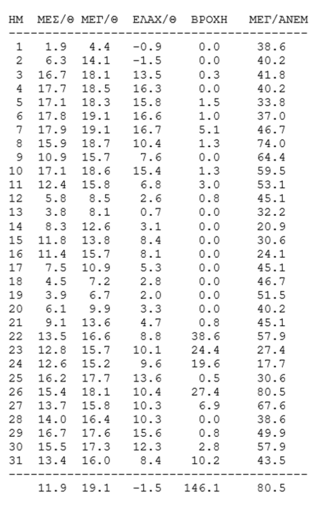 Ιδού τι έκανε από μέσες-μέγιστες-ελάχιστες θερμοκρασίες (βαθμοί Κελσίου), βροχόπτωση (χιλιοστά) και μέγιστο άνεμο (χλμ./ώρα) αυτόν τον Γενάρη, πρώτο μήνα του έτους (2026), σε έναν αναλυτικό πίνακα του σταθμού μας στα Βατερά (Χοχλατσάρι):