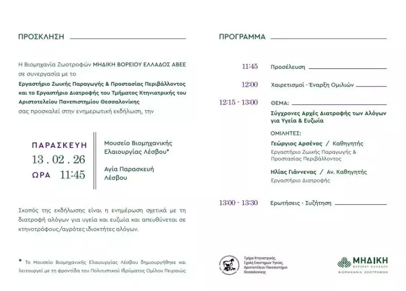 Η βιομηχανία ζωοτροφών ΜΗΔΙΚΗ ΒΟΡΕΙΟΥ ΕΛΛΑΔΟΣ διοργανώνει, σε συνεργασία με το Εργαστήριο Ζωικής Παραγωγής & Προστασίας Περιβάλλοντος